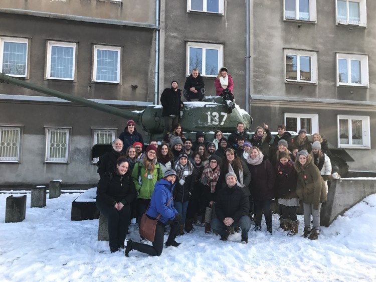 Today will be an interesting day because most students will begin to disengage from their 24/7 classroom, but they will be a sort of limbo state trying to process what they have lived for the last three-plus weeks. There will be a desire to experience everything possible in the next 24 hours and yet the desire to get back to what is familiar, from their own bed to a breakfast they understand (that is the one meal many of them struggle with the most, which is interesting to me because most of them are never up for breakfast at school). Leaving everything behind is not really possible because there are final papers to write and submit, which are due at the end of the month. Next Monday, with the commencement of spring semester, their lives will be back to some kind of normal, but the people they are is much different than the group of people who gathered at JFK on the 26th of December. I want to personally thank Drs. Orla-Bukowska and Stroiński for their unfailing willingness to work with our students. I want to thank Dr. Ewa Nowakowska, the program coordinator, who is gracious beyond words, and Mikolaj Borkowski, who has so ably assisted us for the last two years. It is not often that your class takes you to a city called Nowa Huta, which was designed by Jozef Stalin to be the ultimate communist city, nor is it often that your group picture is on a Soviet T-37 tank. Well, learning will occur and processing of that learning is just beginning, but until the next entry . . .